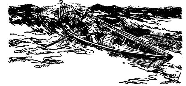 At the stern of dory No. 9 as she hung outboard against the battered rail, Peter Kennedy hove his keg buoy. The blackball fast to it on a slender pole plunged in tumbling, foam-spun surges. It leaped up, dipping again as the keg bobbed aft, snatched swiftly away by the rush of the heavily rolling vessel under both sail and engine power. Into the awesome majesty of star flecked night and sea faded the crude “9” daubed on the black-ball. The carefully coiled line twitched away.