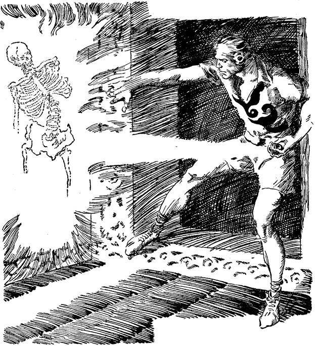 THE man grinned in that ironical way and sat on the corner of a desk. He lighted his pipe again and watched the scramble. He looked a little like a laughing skull—except for his nose. His nose was perhaps the most remarkable part of him. I’m almost prepared to say that it was four inches long, and it came to a flat point like a chisel. And for the rest of his face, it was fantastically ugly, so ugly that it was almost attractive. He had bright, puckery little eyes, and a huge full-lipped mouth, but his cheeks were emaciated and drawn like a mummy’s. His English was perfect and rather American, but there was something about him that was not American at all, in spite of his shiny frayed tweeds and his look of a derelict newspaper man.