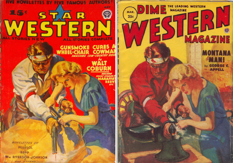Anyway, the other interesting point about this issue, to me at least, is the cover. When i saw it, I was reminded of another cover, and i went looking for it. Here it is, changed from the Star Western May 1939 issue.